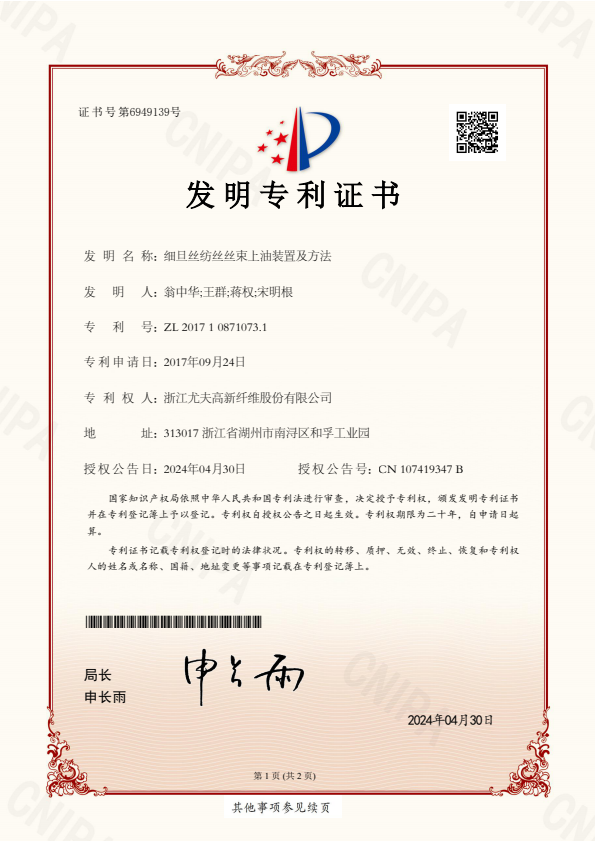 發明專利證書細旦絲紡絲絲束上油裝置及方法